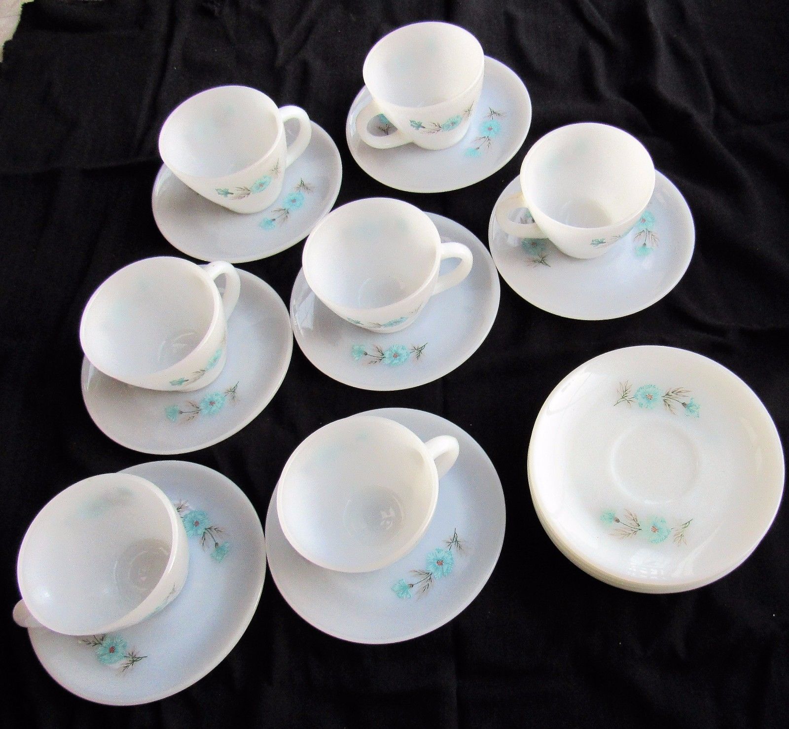 Title (ebay affiliate link): FIRE KING MILK GLASS BONNIE BLUE TURQUOISE 7 SETS CUPS SAUCERS PLUS 7 SAUCERS