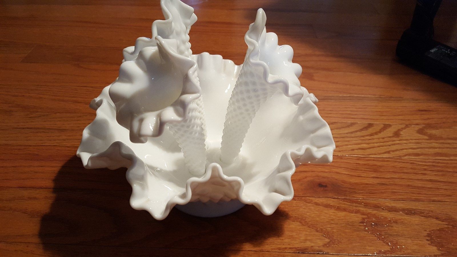 Title (ebay affiliate link): VTG FENTON EPERGNE 3 HORN CENTERPIECE WHITE HOBNAIL MILK GLASS RUFFLE VASE BOWL