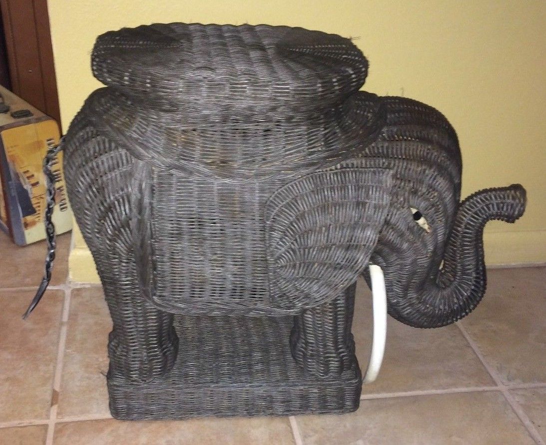 Vintage 70''s WICKER ELEPHANT Tusks Up Plant Stand Side Table Gray