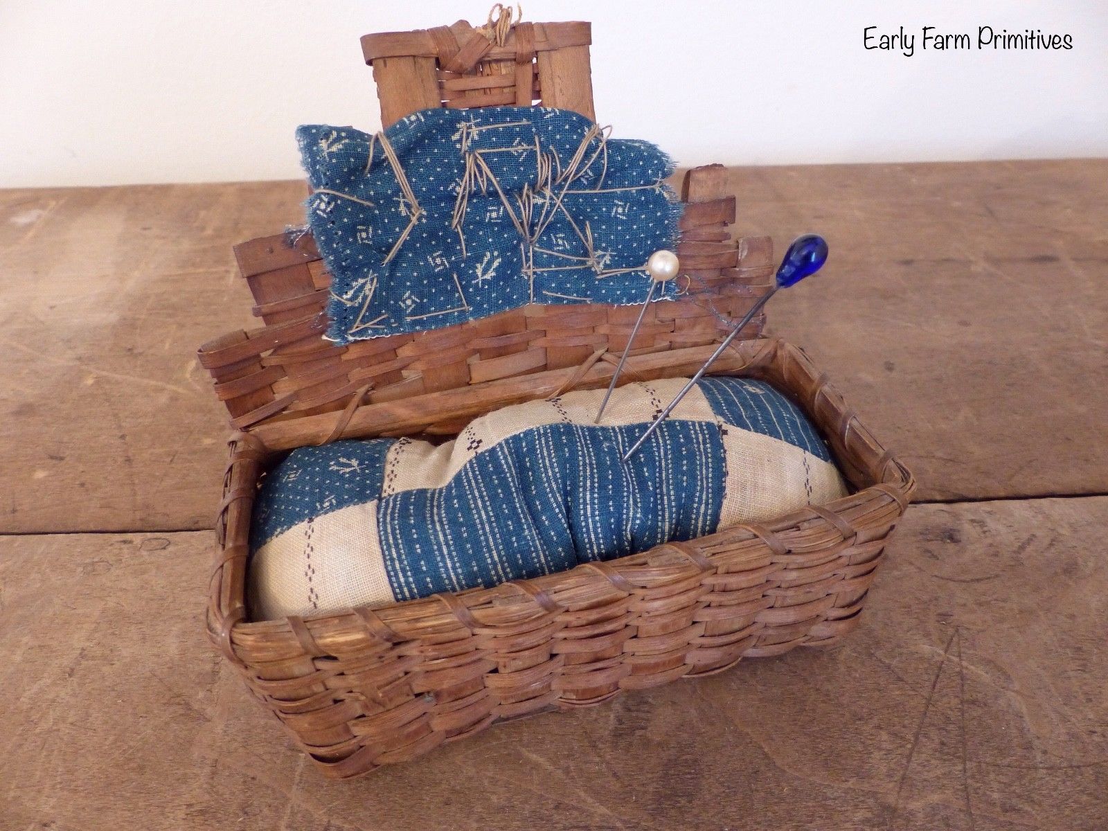 Title (ebay affiliate link): TINY EARLY ANTIQUE BASKET MAKEDO SEWING PIN KEEP "EARLY CALICO"