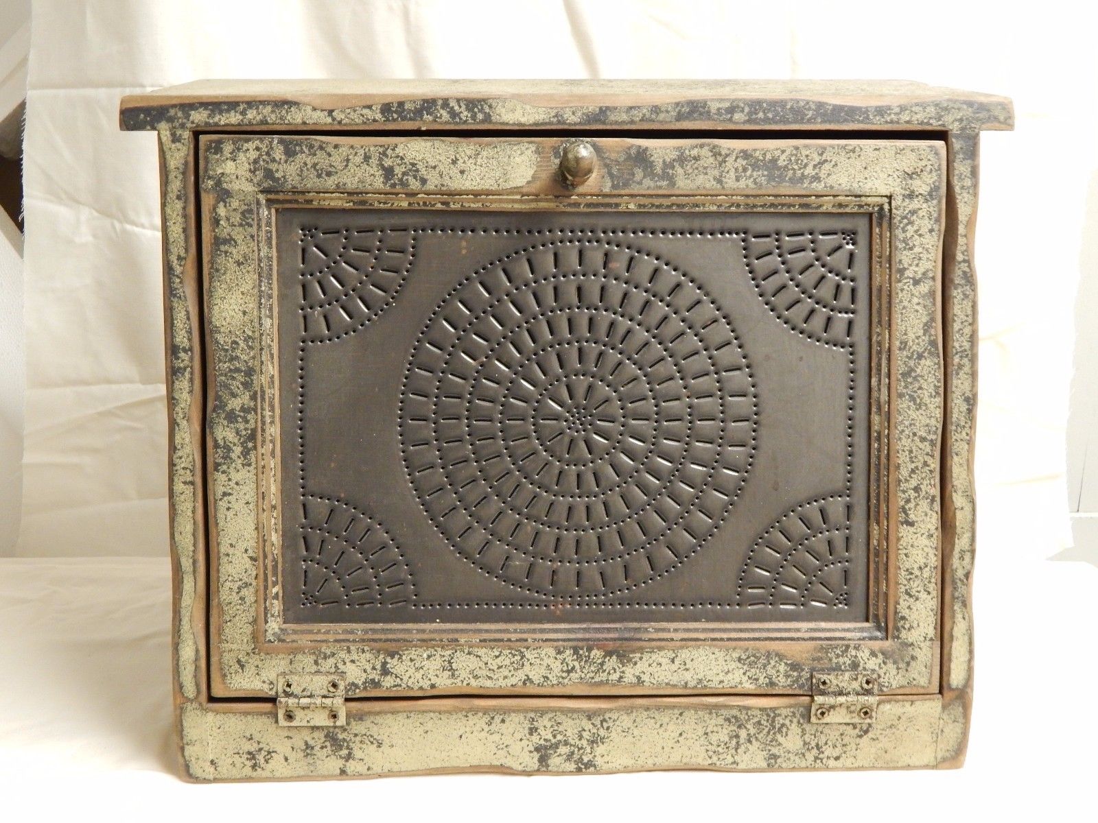 Primitive Style Wooden Bread Box with Punched Tin Design