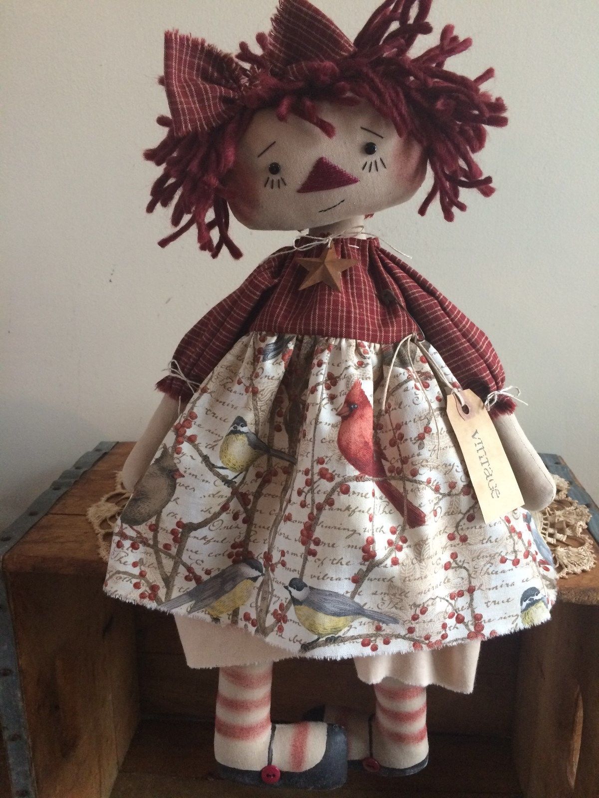 Title (ebay affiliate link): Primitive Raggedy Annie Birds & Rusty Barn Star Vintage Annie