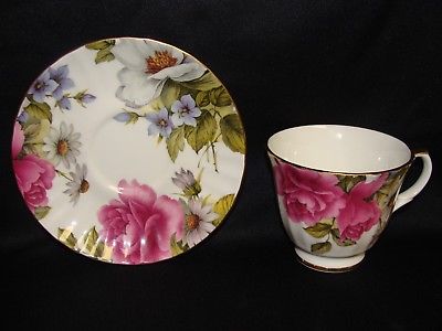 Title (ebay affiliate link): Duchess Bone China Cup & Saucer England Pink Purple White Flowers Gold Trim