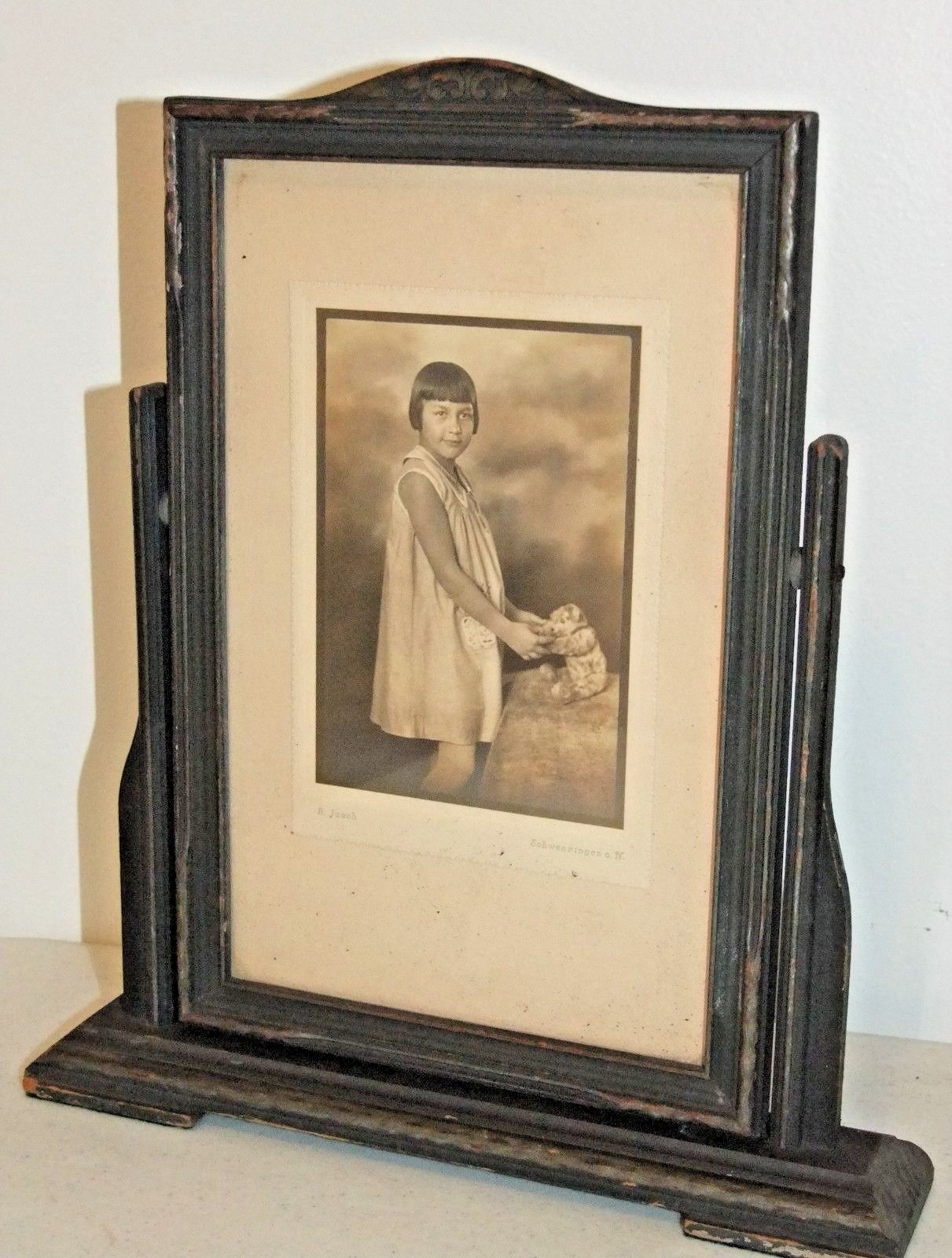 Title (ebay affiliate link): Antique Tilt-Swing-Swivel Picture Frame, Table Top, Girl with Teddy Bear Photo