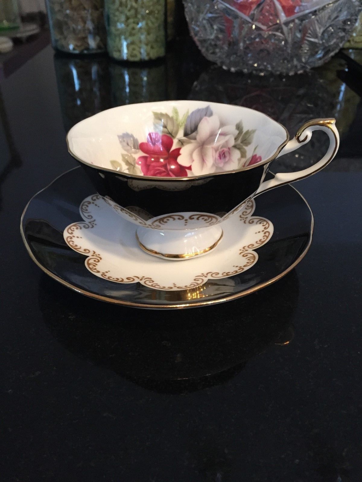 Title (ebay affiliate link): Queen''s Ebony Fine Bone China Black Gilt Pedestal Cup & Saucer~Beautiful Rose''s