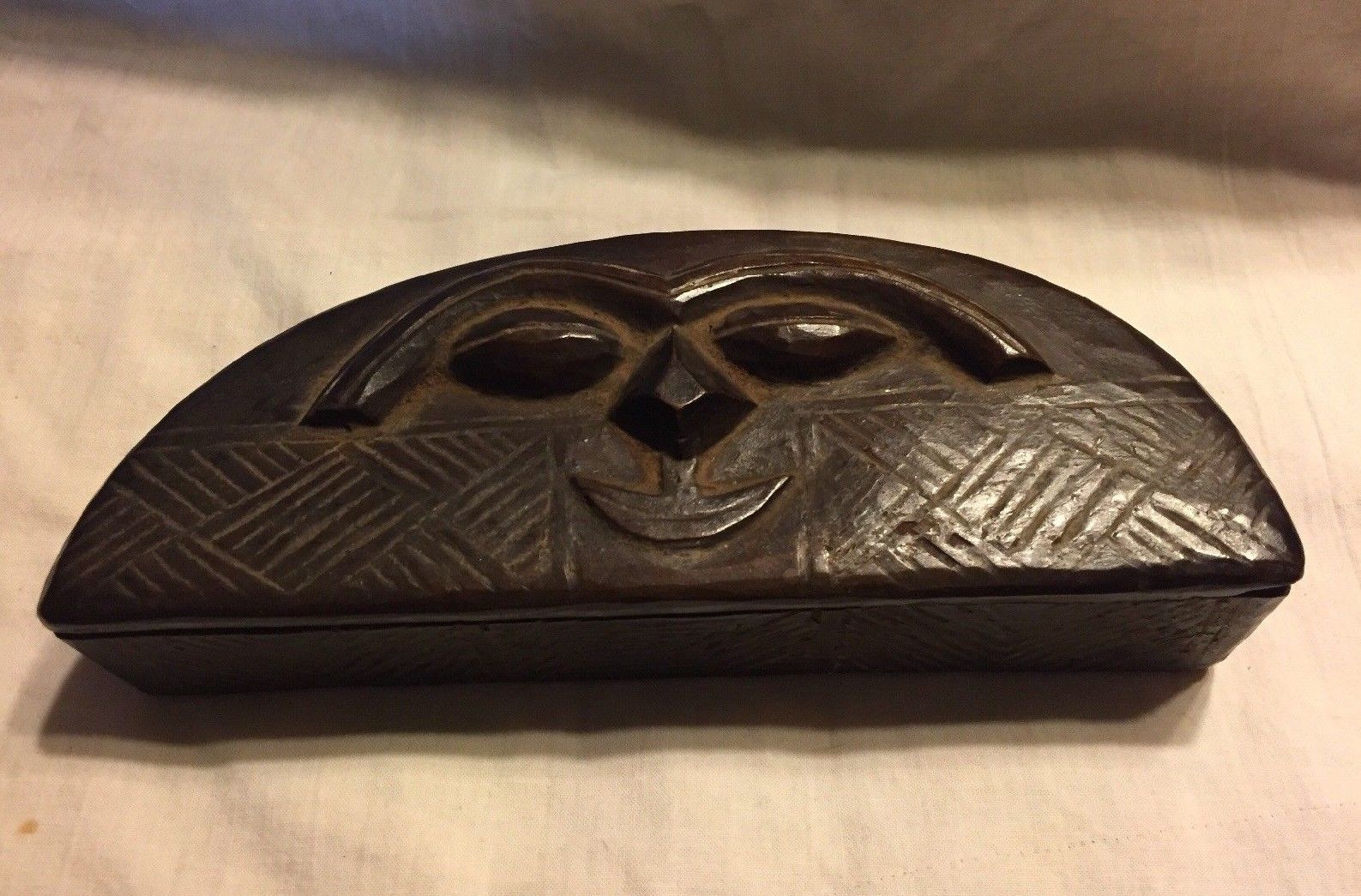 Antique Vintage Primitive Hand Carved Wood Trinket Box, Face on Lid
