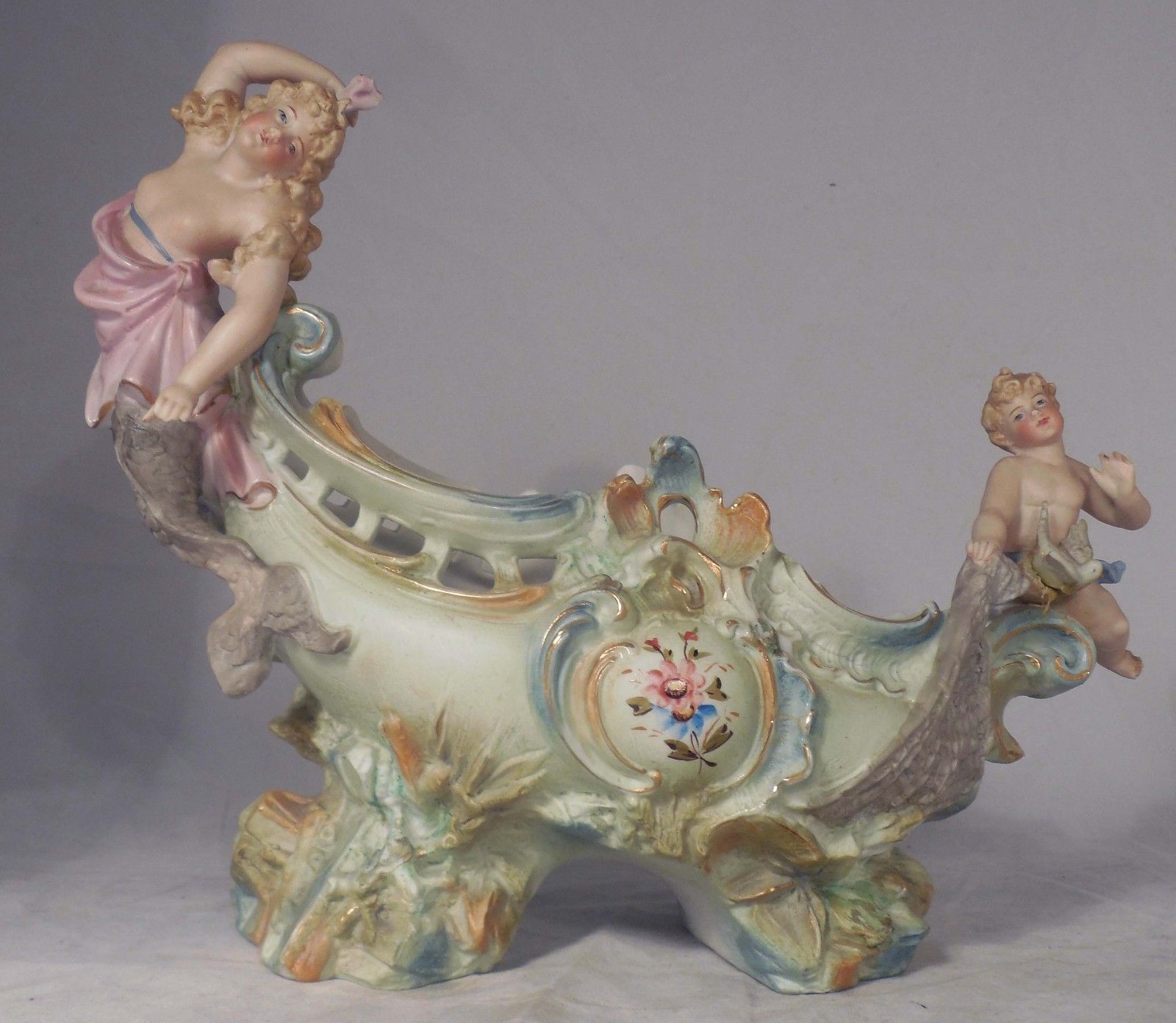 German Bisque Nautical Bowl Planter Figurine Mermaid Cherub Shell Mint Green