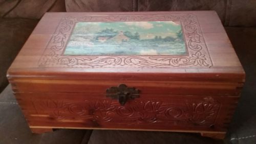 Title (ebay affiliate link): Vtge Carved Jewelry Box Footed Mirror Cedar Knotty Pine Countryside Pic