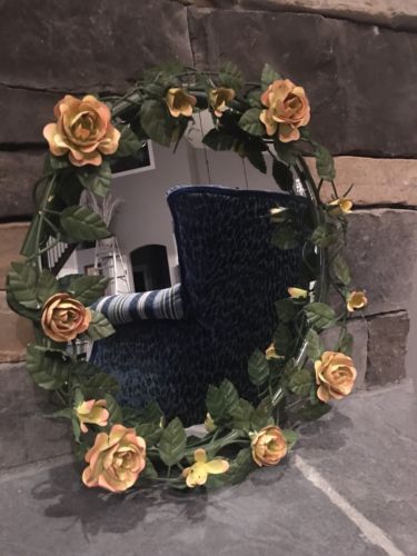 Italian Tole Oval Mirror Table Plateau Yellow Roses Flowers 16x14