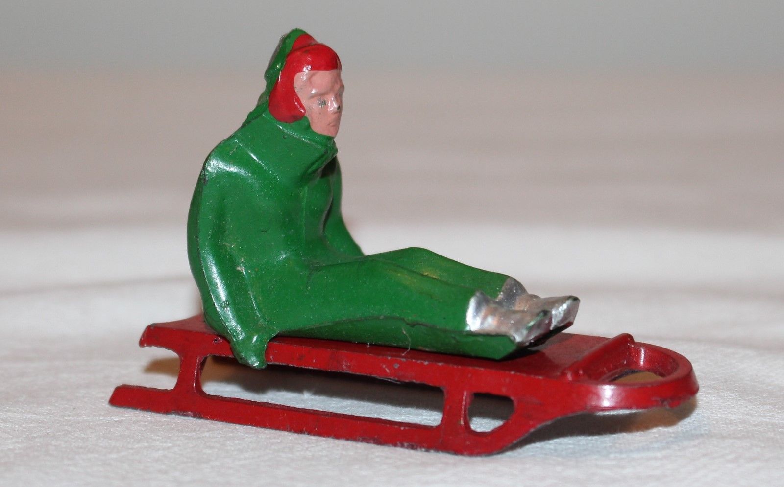 Title (ebay affiliate link): Green suited Boy, riding Red Sled. 1930s Barclay Lead Figure. U.S.A.