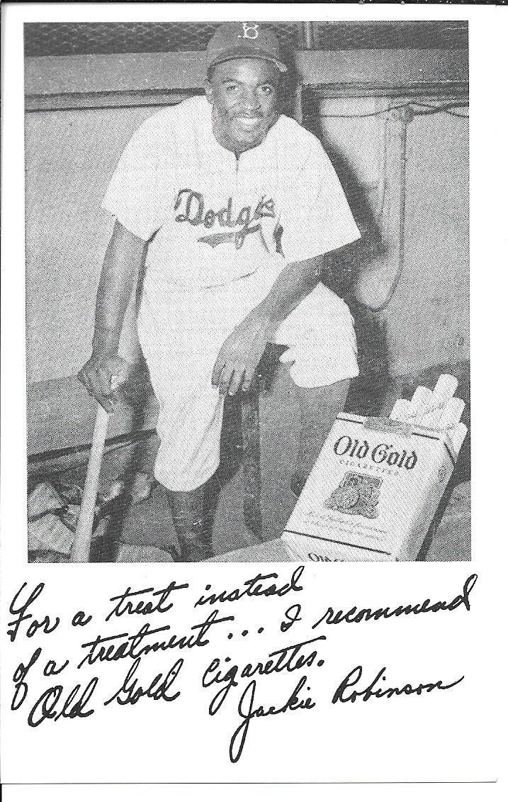 Title (ebay affiliate link): B&W reprinted postcard of Jackie Robinson advertising Old Gold cigarettes