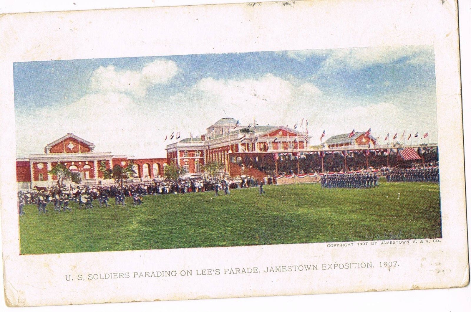 Title (ebay affiliate link): PRE-LINEN Postcard U. S. SOLDIERS PARADING IN LEE''S PARADE, 1907, JAMESTOWN, VA