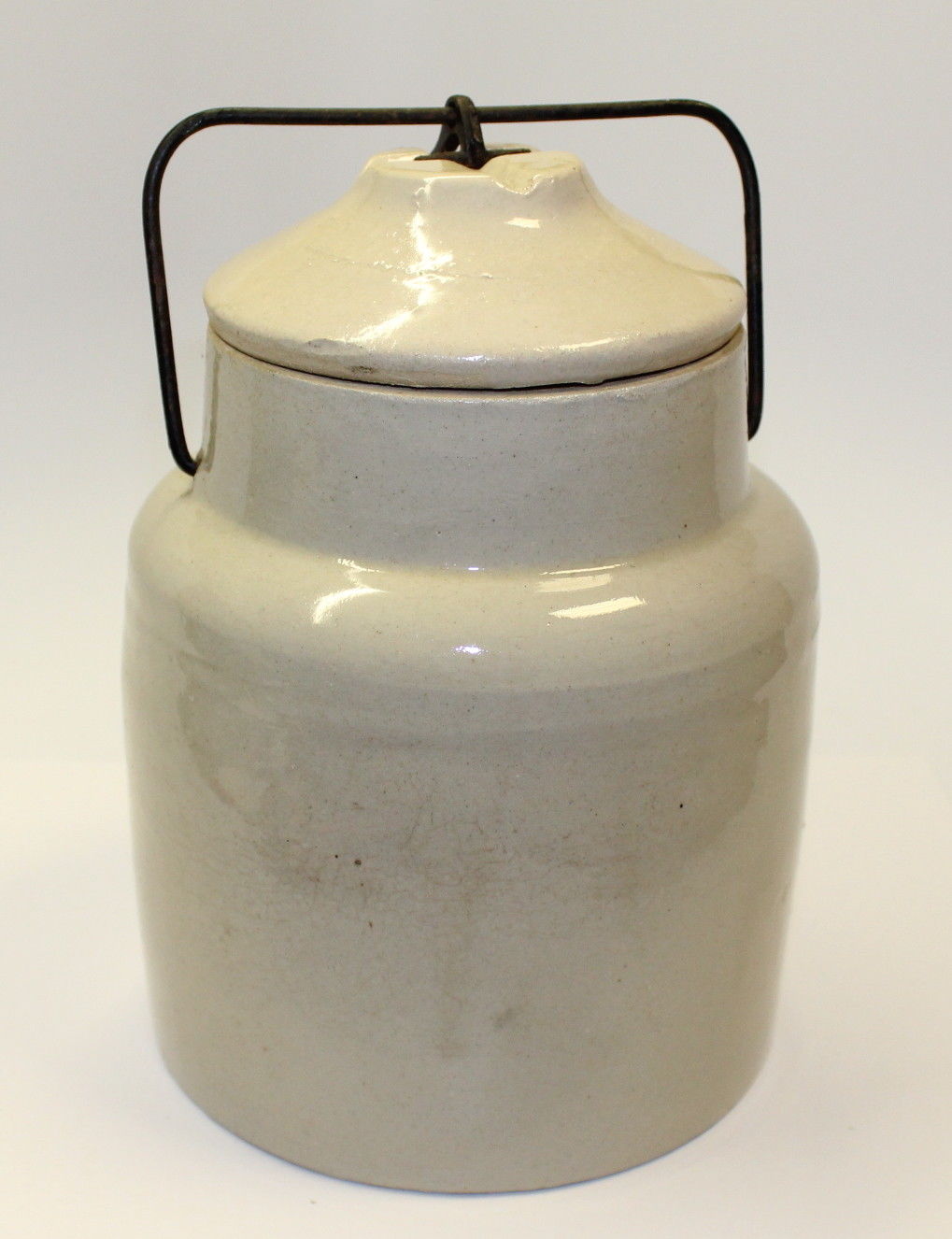 Vintage White Stoneware Crock Jar with Metal Clamp and Handle