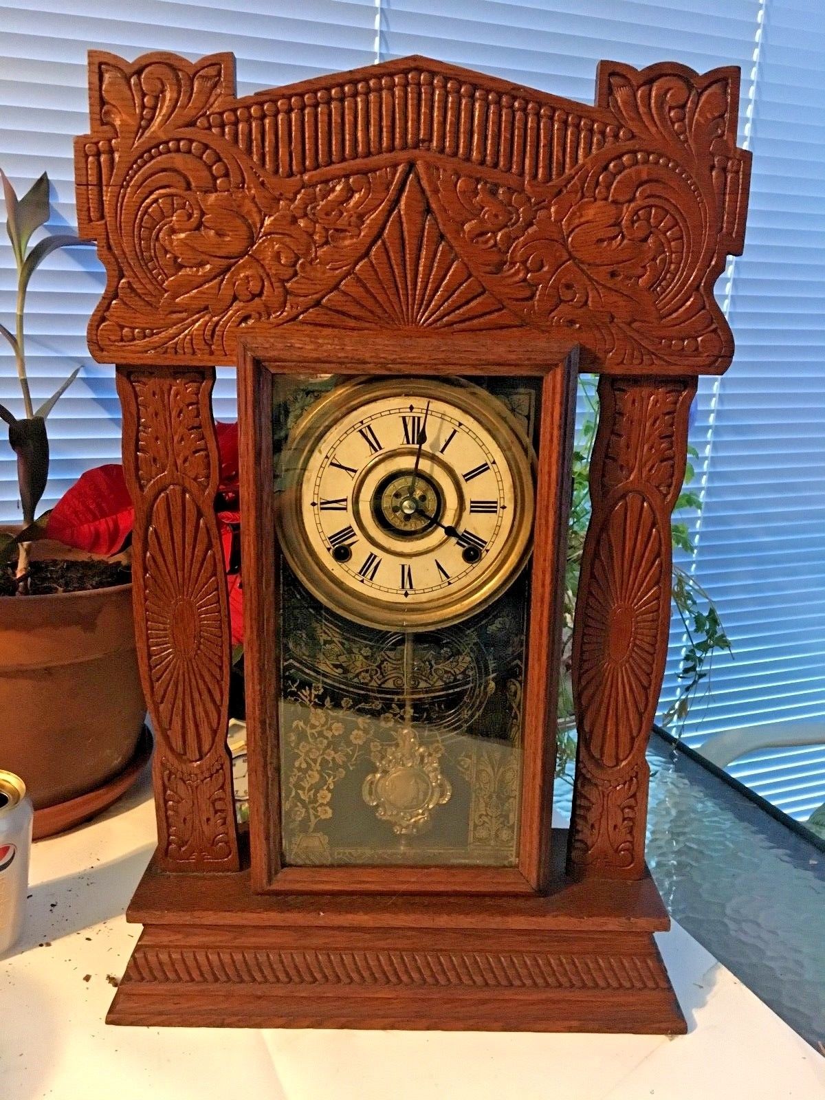 Title (ebay affiliate link): Unsigned Pressed Oak Fancy Gingerbread Clock - Running - Time, Strike and Alarm