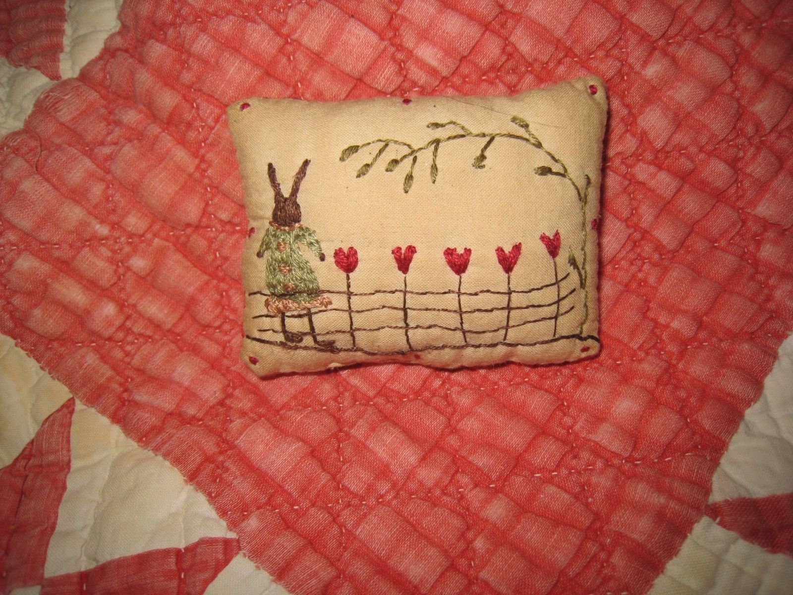 Title (ebay affiliate link): Primitive tiny Sampler Pillow * MS.RABBIT STANDS BY FENCE w/ HEARTS