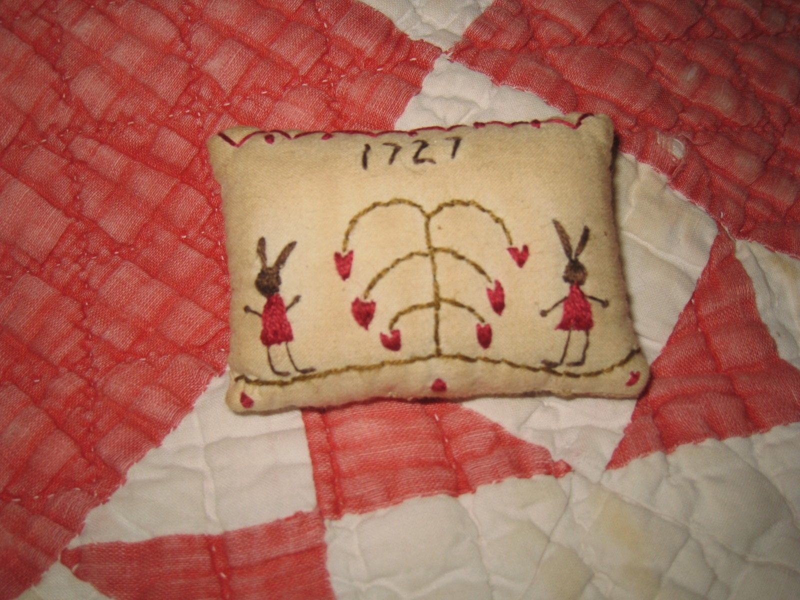 Title (ebay affiliate link): Primitive tiny Sampler Pillow *1727 Two Rabbits Standing By Heart Tree. Folk Art