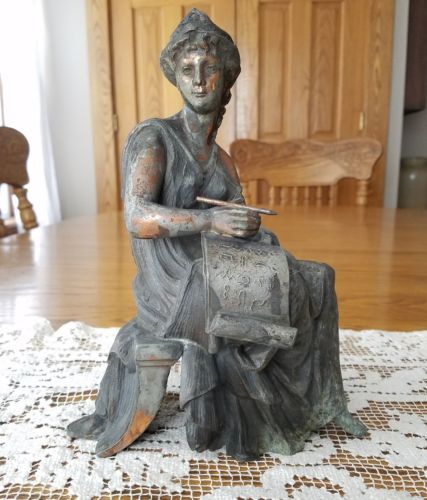 Title (ebay affiliate link): Antique Clock Topper Statue Cast Metal Spelter Greek Woman Egyptian Hieroglyphs