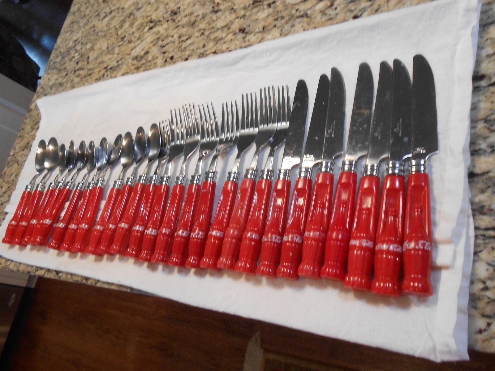 Title (ebay affiliate link): 26 PCS COCA COLA BOTTLE RED STAINLESS SILVERWARE, STAINLESS FLATWARE BY GIBSON