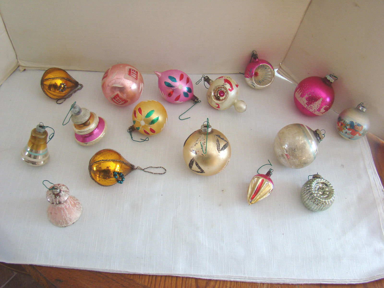 Title (ebay affiliate link): 16 VTG GLASS CHRISTMAS BULBS - MERCURY, MICA AND GLITTER - BELLS, INDENTS, ETC.