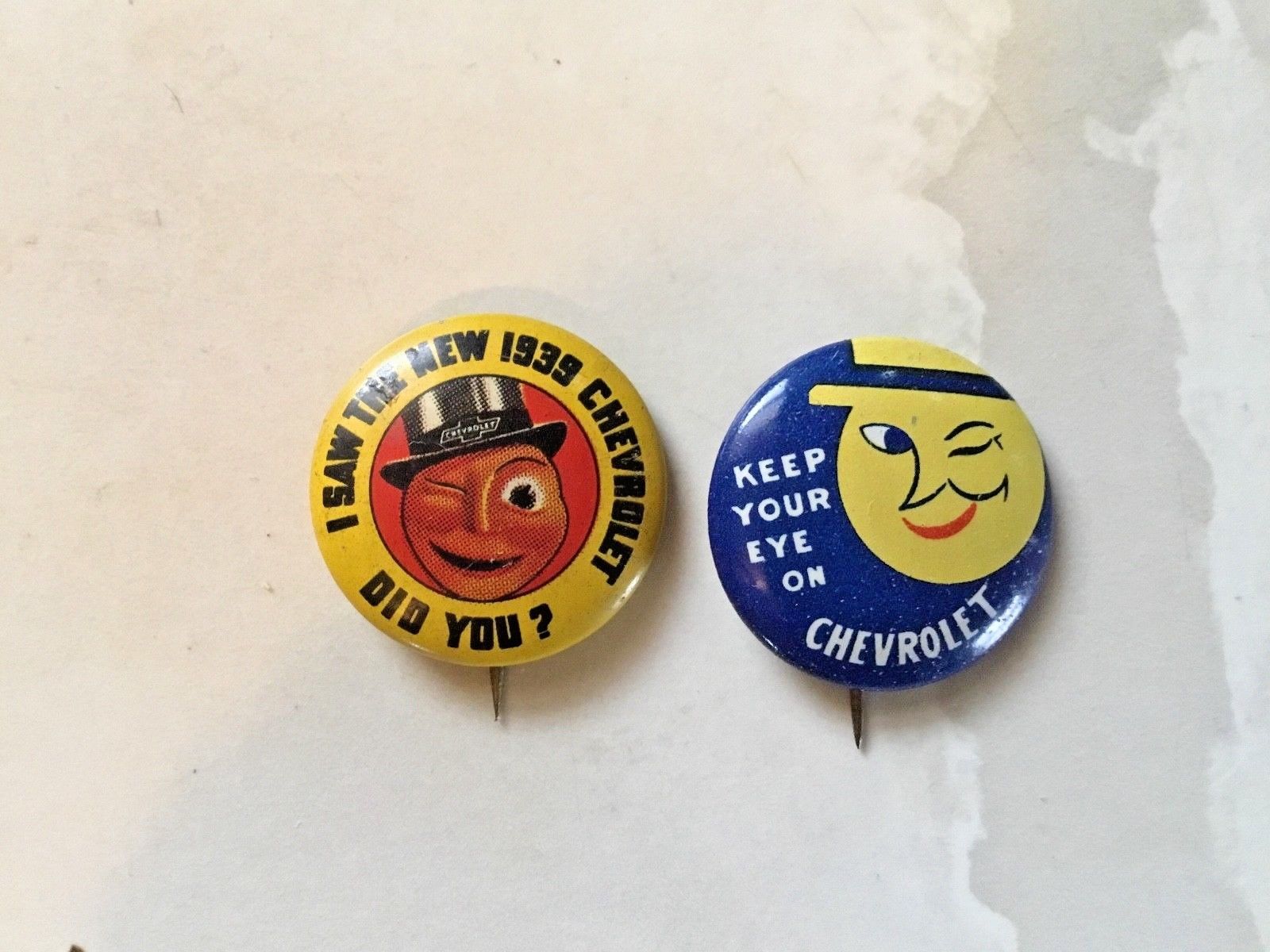 (2) 1939 CHEVROLET automobile Pinback Button Pin advertising sign car automotive