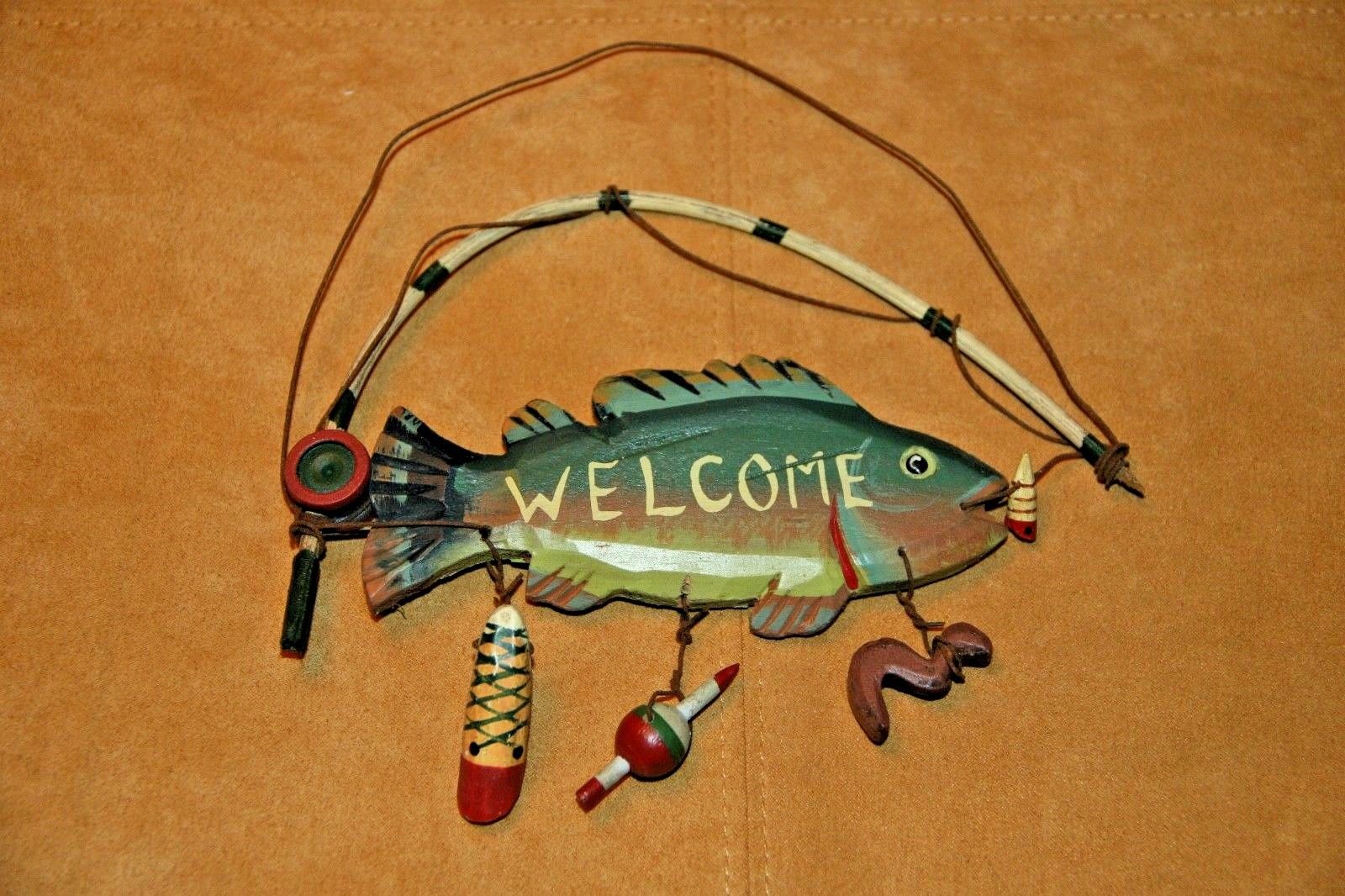 Title (ebay affiliate link): "WELCOME" FISH ORNAMENT FISHING POLE, BOBBINS, RUSTY WIRE HANGER... 5 3/4"