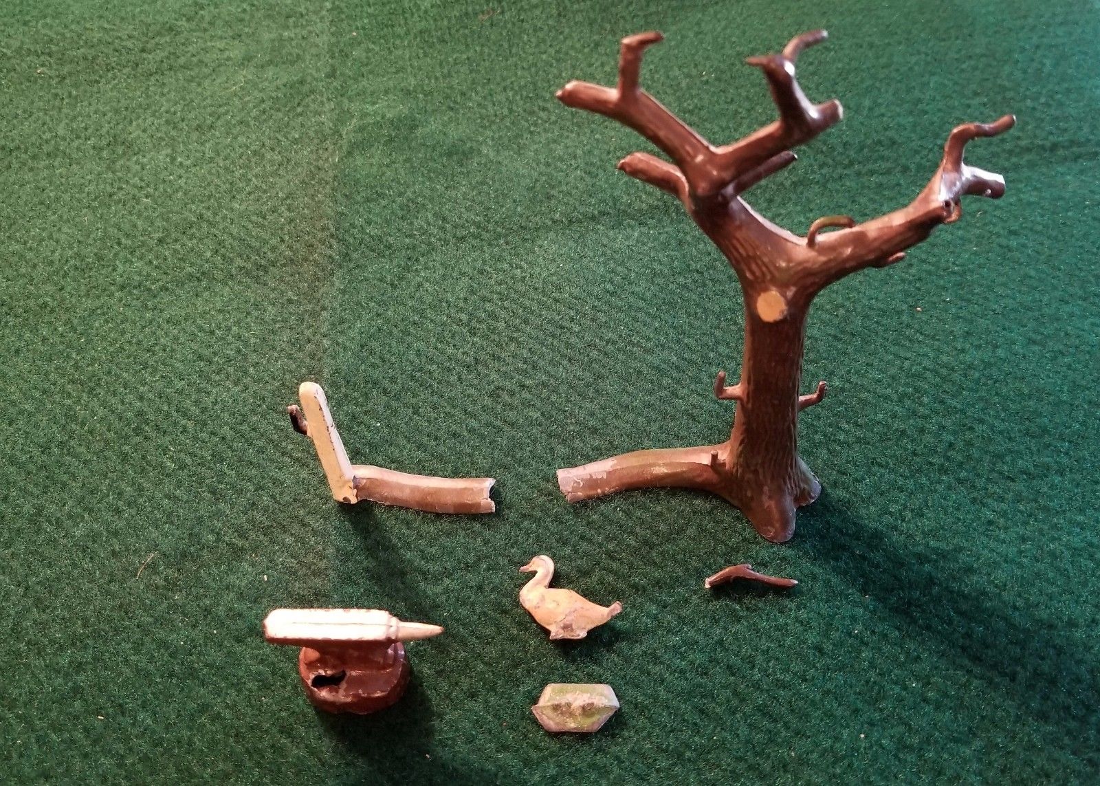 BRITAIN''S TREE & GATE POST, MISSING GATE AND DUCK BOTH IN NEED OF REPAIR,& ANVIL