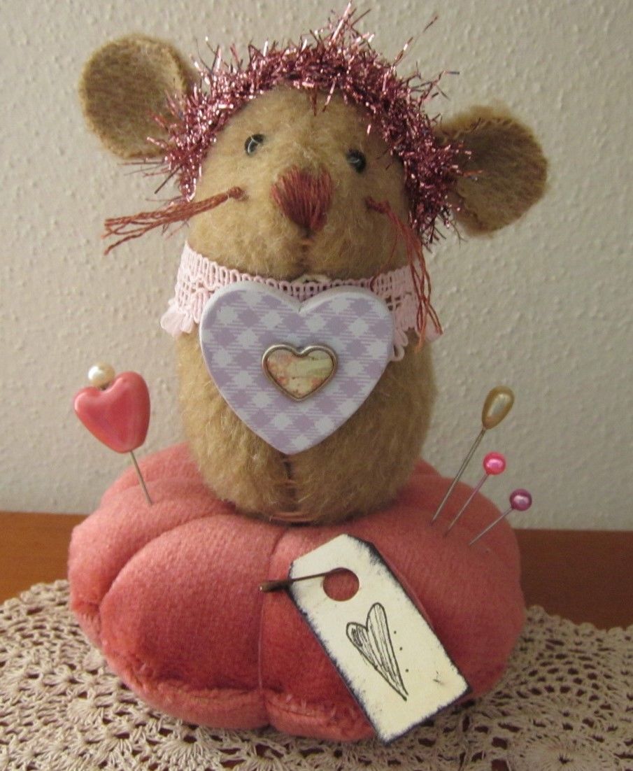 Title (ebay affiliate link): PRIMITIVE WOOL VELVET MOUSE VALENTINES DAY HEART MAKE DO PIN CUSHION PFATT