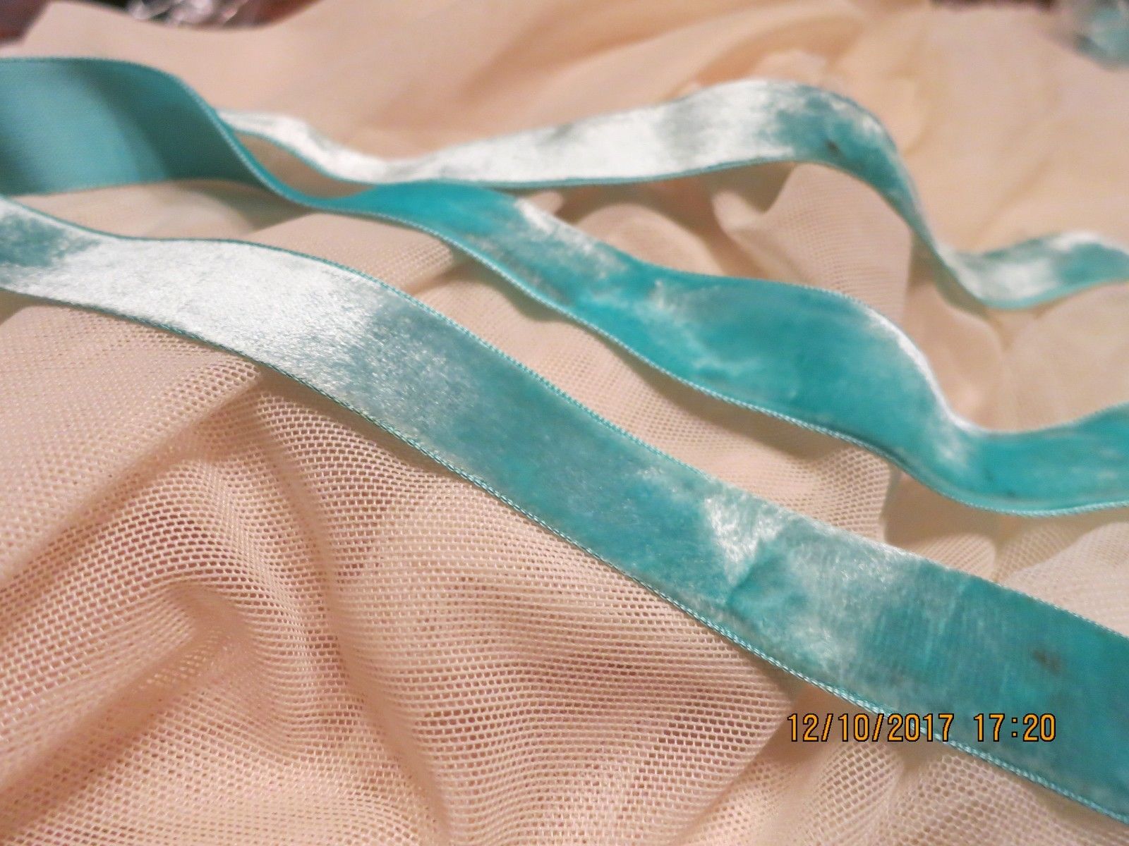 Title (ebay affiliate link): VINTAGE YUMMY SOFT LUSCIOUS TEAL BLUE SILK VELVET RIBBON DOLL ART 1 YD VR10
