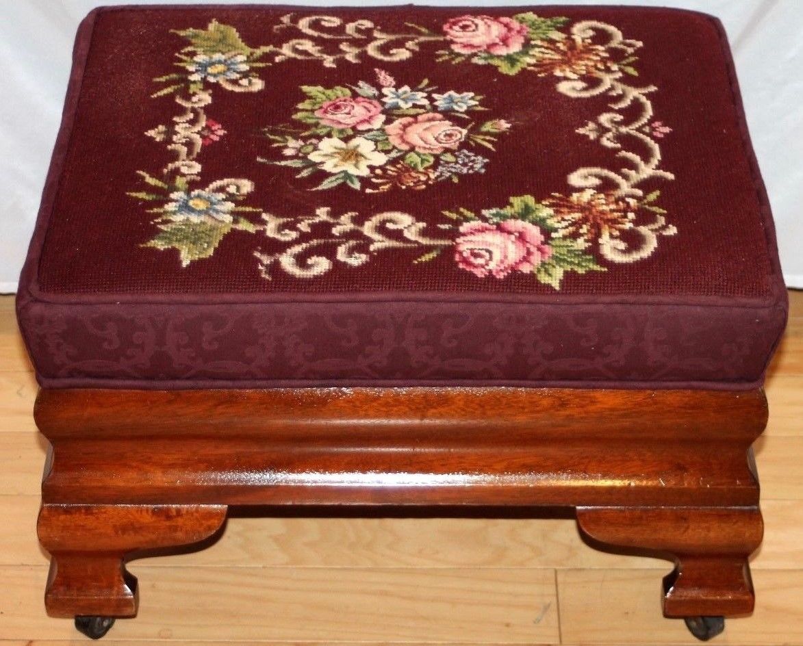 Title (ebay affiliate link): ANTIQUE MAHOGANY XL EMPIRE VICTORIAN FOOTSTOOL W/ PILLOWED NEEDLEPOINT & CASTERS