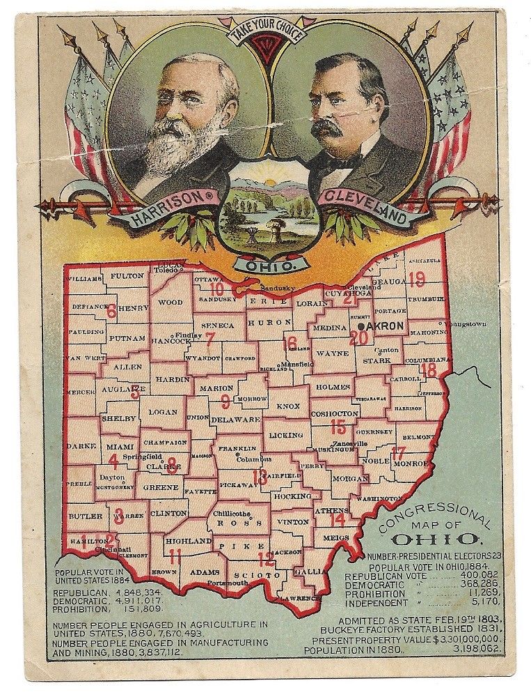 HARRISON AND CLEVELAND OHIO CONGRESSIONAL MAP, BUCKEYE MOWER 1888 AD CARD