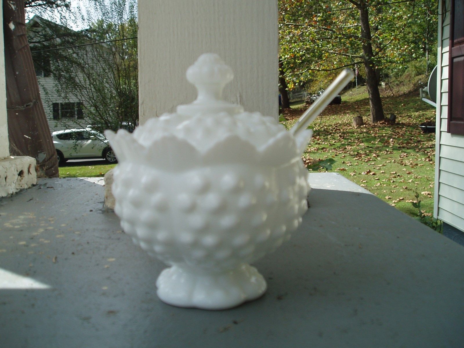 Title (ebay affiliate link): vintage Fenton Hobnail milk glass sugar bowl with lid and glass spoon