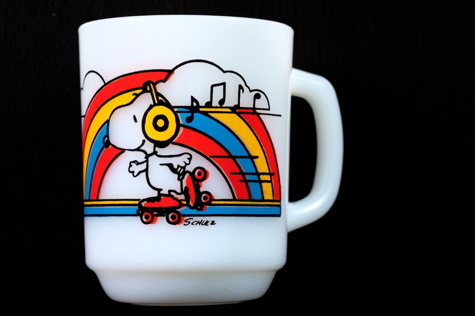 Title (ebay affiliate link): Snoopy Anchor Hocking Mug, Roller Skater''s Waltz, Rainbow, Milk Glass, Vintage