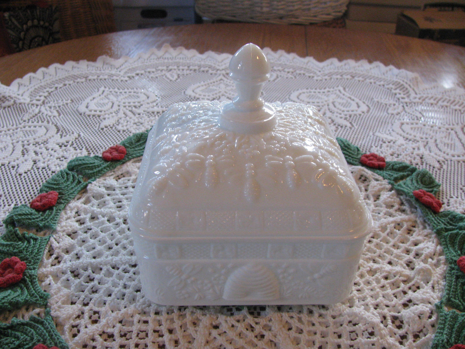 Title (ebay affiliate link): Vintage "Tiara" White Milk Glass Square Candy Dish w/ Bees & Hives Design