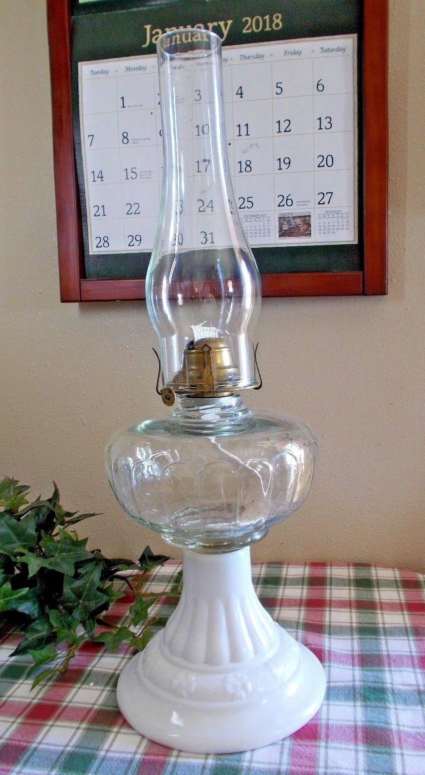 Title (ebay affiliate link): Antique Kerosene Oil Lamp Milk Glass Base with Flowers Queen Anne Burner