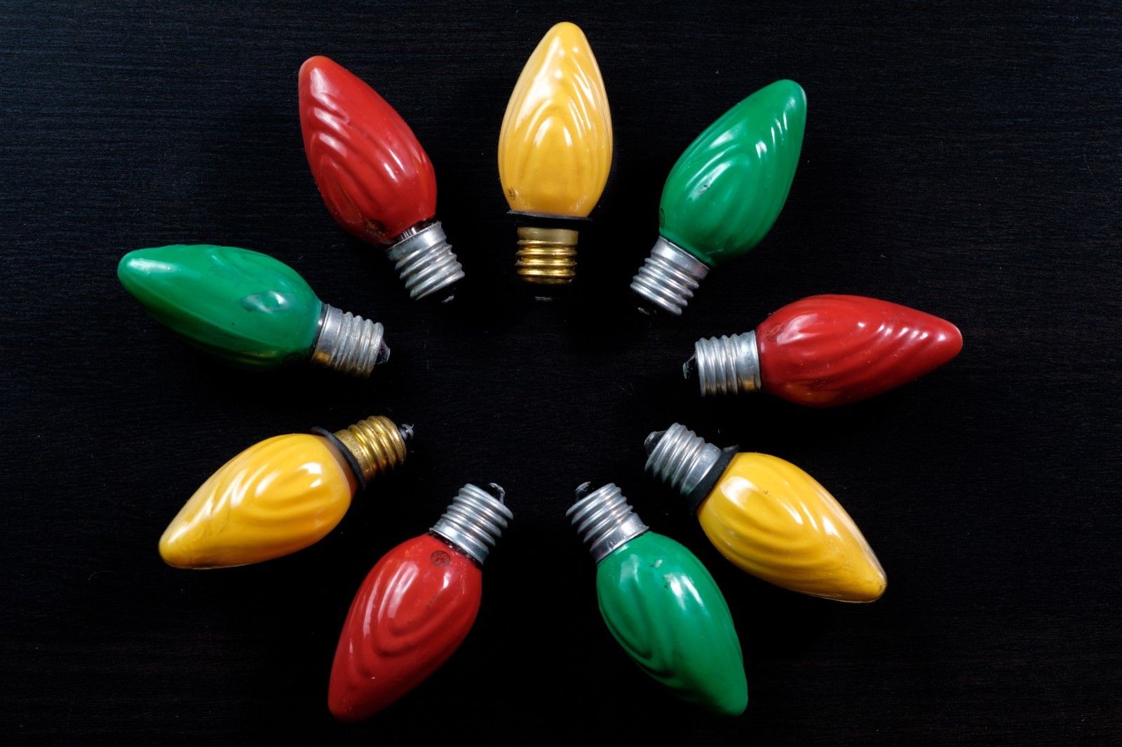 Title (ebay affiliate link): 9 Vintage Christmas Light Flame Swirl C-9 C9 Red Yellow Green Ceramic Bulbs USA
