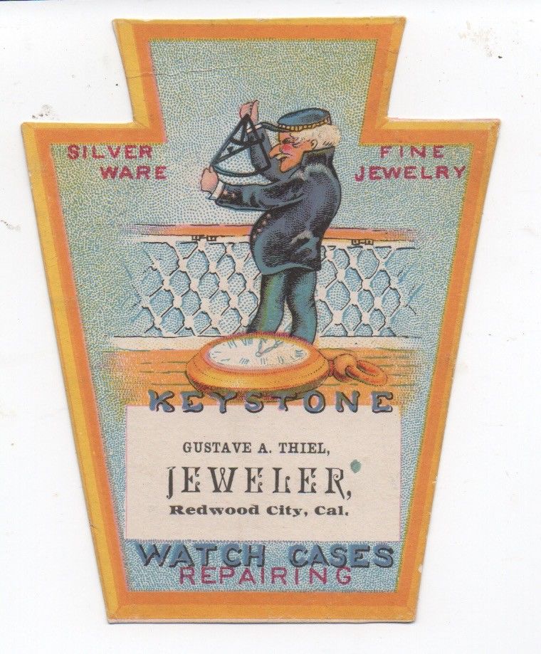 Title (ebay affiliate link): 1890s die cut Trade Card Gustave Thiel Jeweler Redwood City San Mateo CA