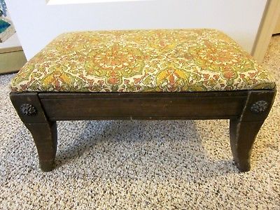 Title (ebay affiliate link): Antique Wood Cloth Covered Foot Stool Carved Button Corners