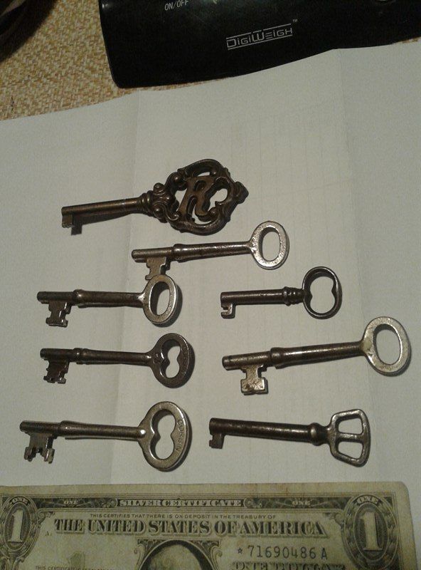 8 VINTAGE SKELETON KEYS,STEAMER TRUNK CORBIN Antique door lock grandfather clock