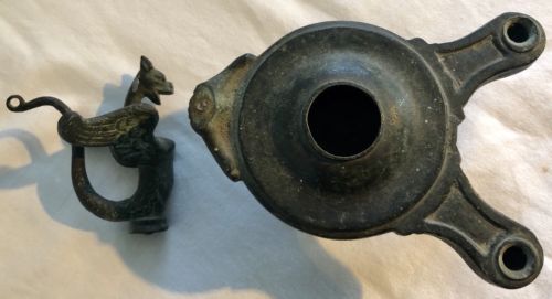 Title (ebay affiliate link): VINTAGE BRONZE HAND HELD WHALE OIL LAMP DRAGON HANDLE