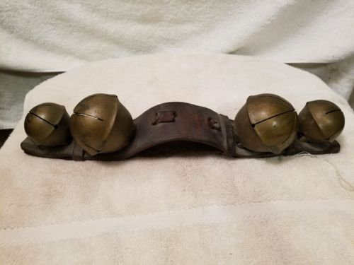Title (ebay affiliate link): 4 Antique Sleigh Bells 4" & 2 1/2" on an 16" Leather Strap Horse Harness