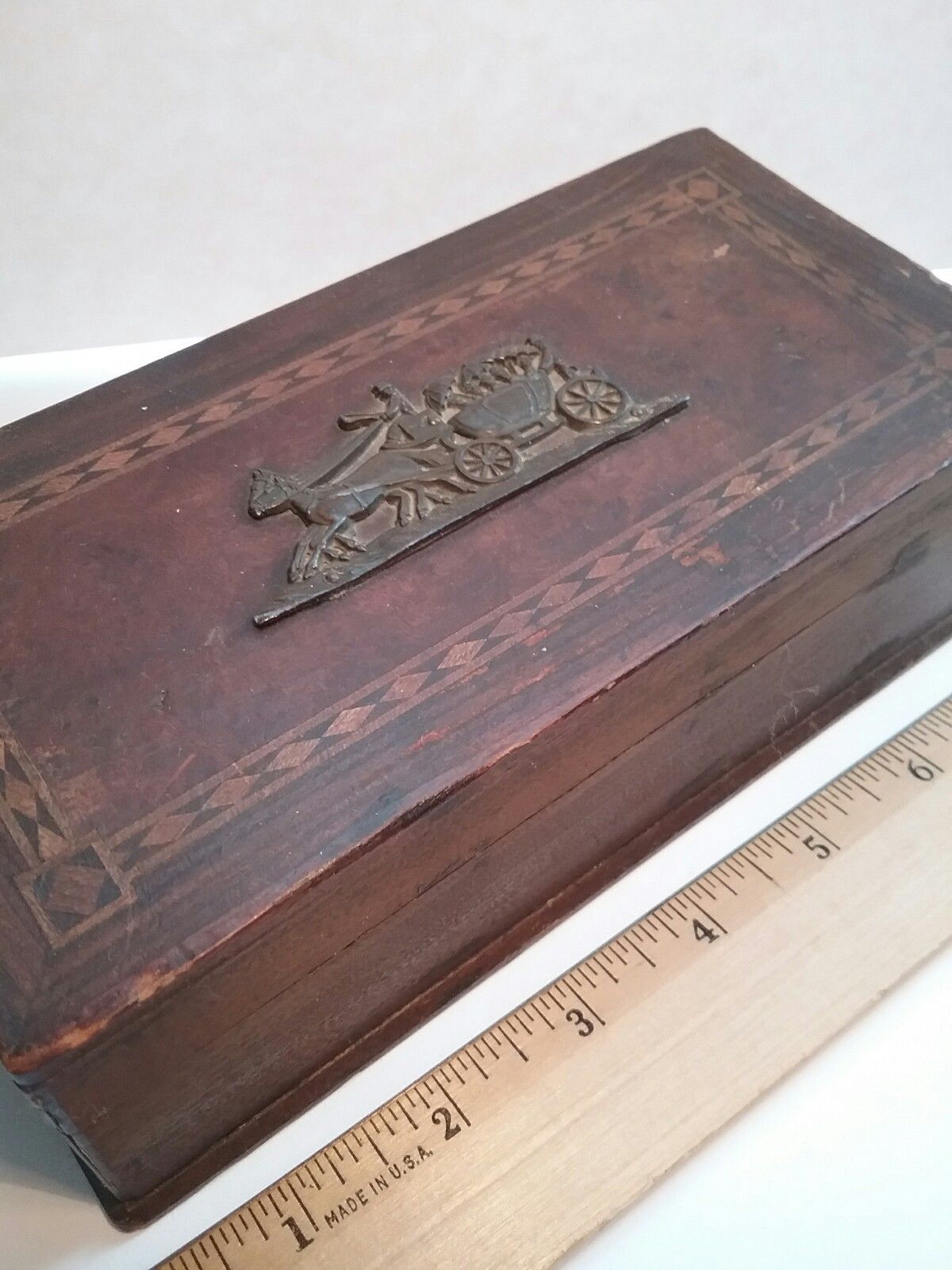 Title (ebay affiliate link): Antique INLAID DECORATED WOOD BOX - Coach & 2 with ladies Lid Decor - No Damage