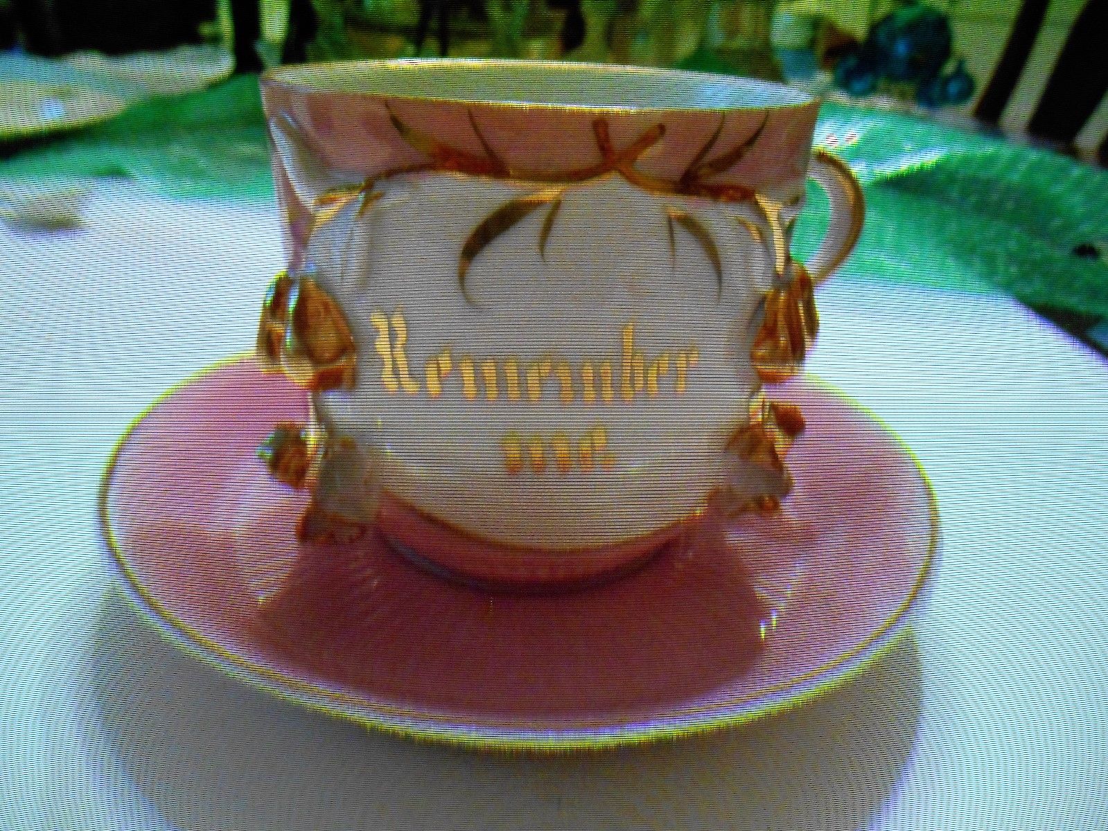 Title (ebay affiliate link): German pink Remember Me coffee cup and saucer lusterware profusely decorated