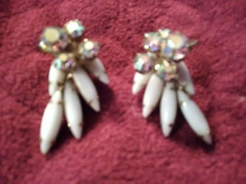 Title (ebay affiliate link): Vintage Aurora borialis clip on earrings milk glass rhinestone cluster clipons