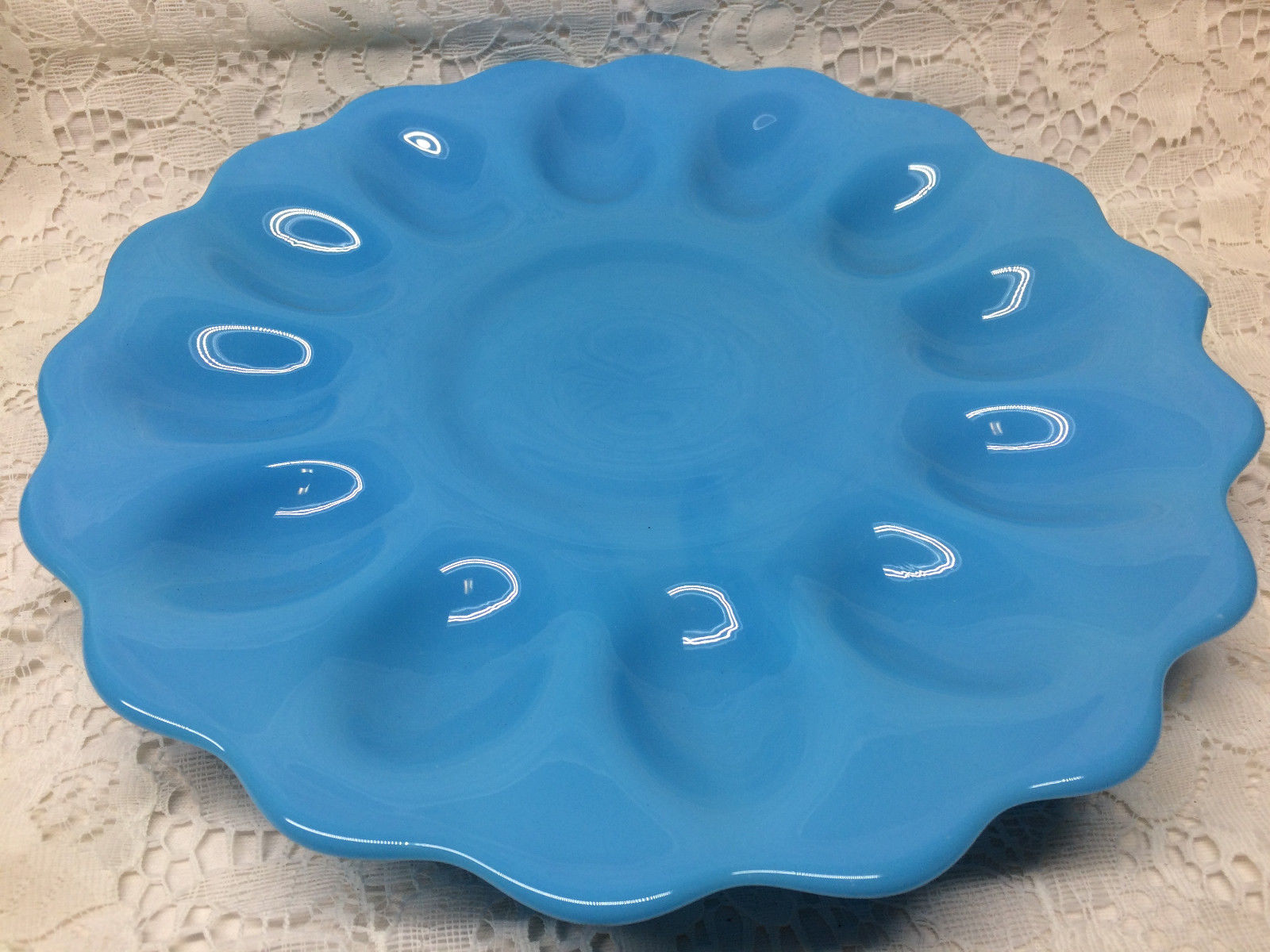 Title (ebay affiliate link): Blue milk glass Deviled Egg serving Plate / Platter tray milk bonnie opaque baby