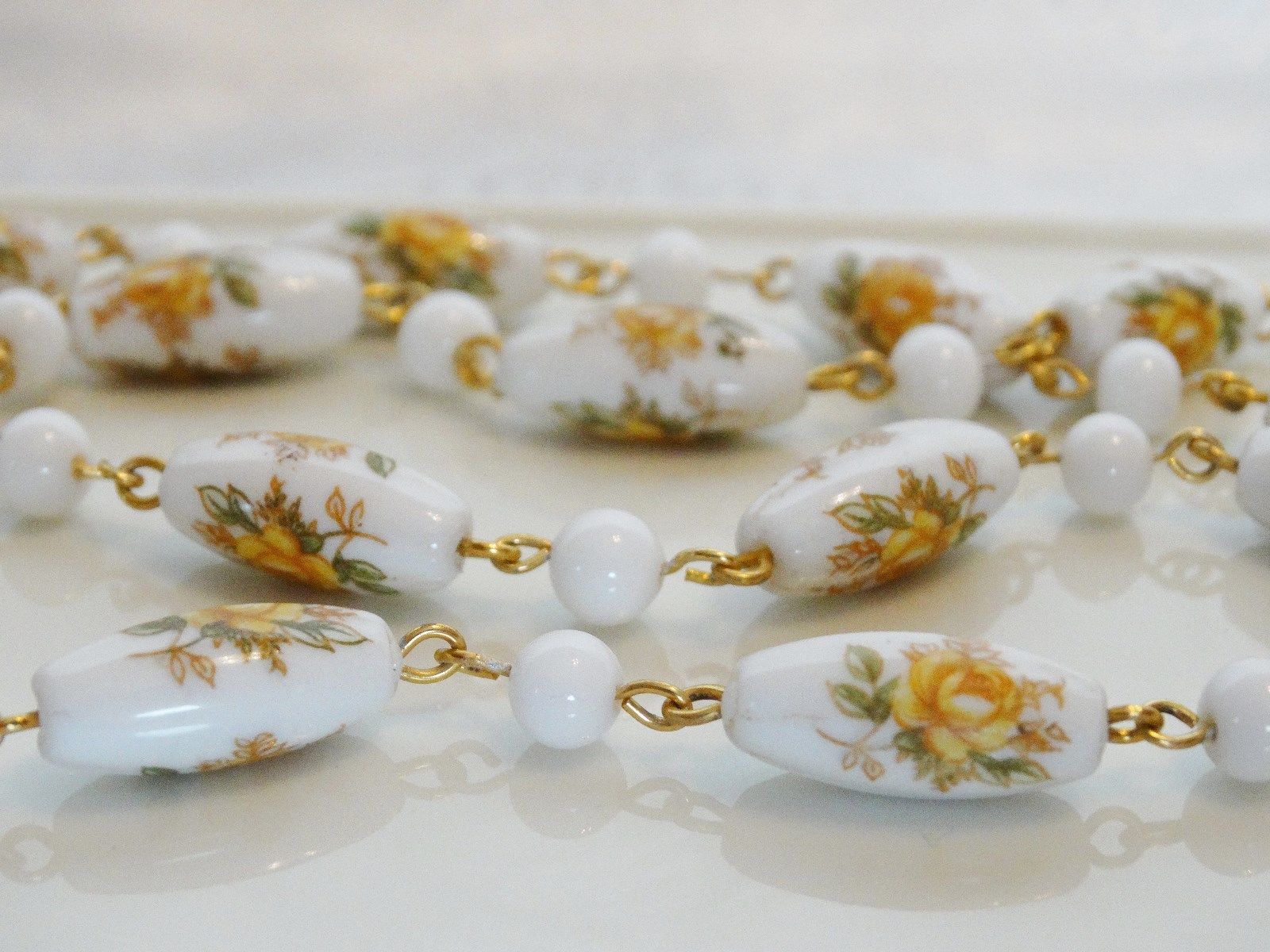 Title (ebay affiliate link): "REMARKABLE" VINTAGE "MILK GLASS with YELLOW ROSES" BEAD NECKLACE