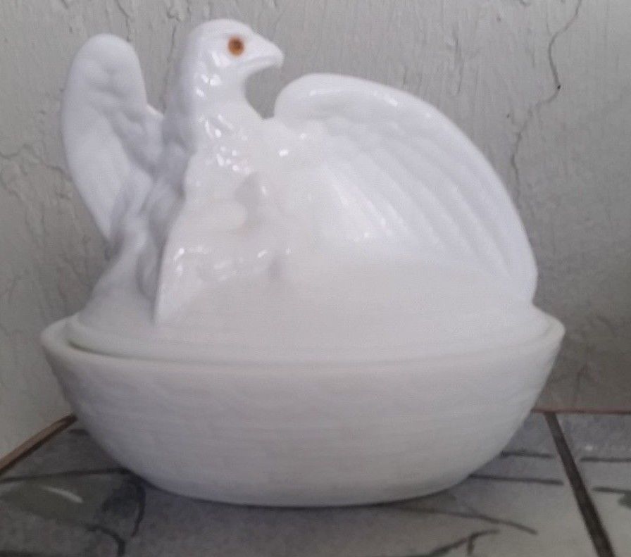 Title (ebay affiliate link): Westmoreland White Milk Glass Animal Covered Dish. Eagle With Colored Eyes.