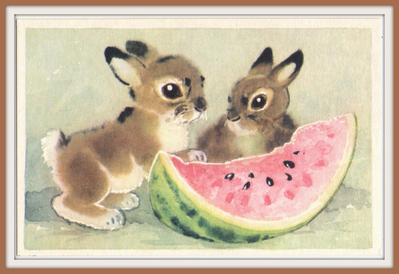 Title (ebay affiliate link): 1970 Little Bunnies WATERMELON Rabbit Artist GAMBURGER Russian art postcard vtg