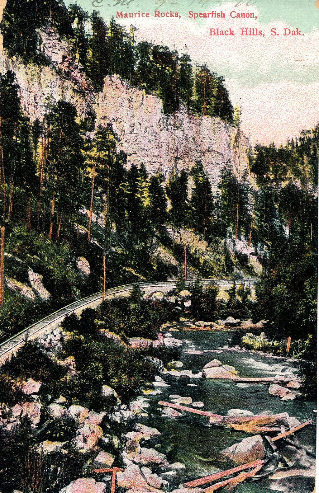 MAURICE ROCKS, SPEARFISH CANON, BLACK HILLS, S.DAK. SD. SOUTH DAKOTA. RAILROAD.