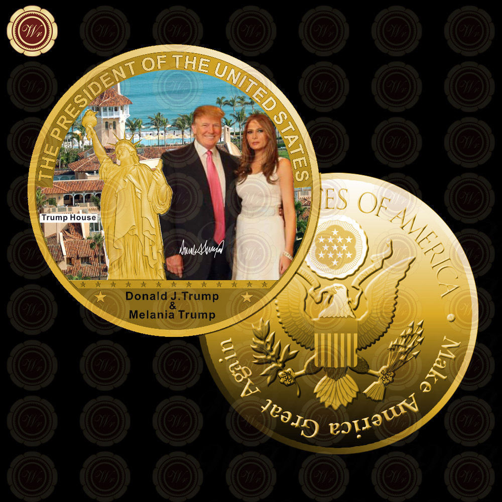 Title (ebay affiliate link): WR 45TH President Donald Trump & First Lady Souvenir Gold Plated Coin Collection