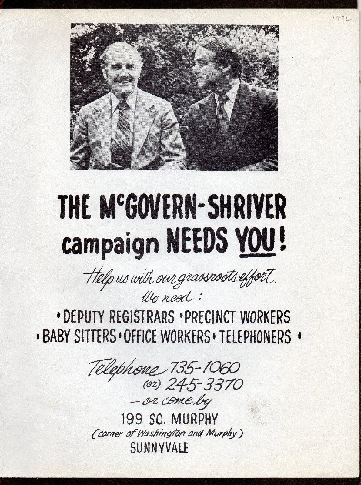 Title (ebay affiliate link): 1972 "McGOVERN - SHRIVER Campaign NEEDS YOU!" Grassroot SUNNYVALE, CA Rare FLYER